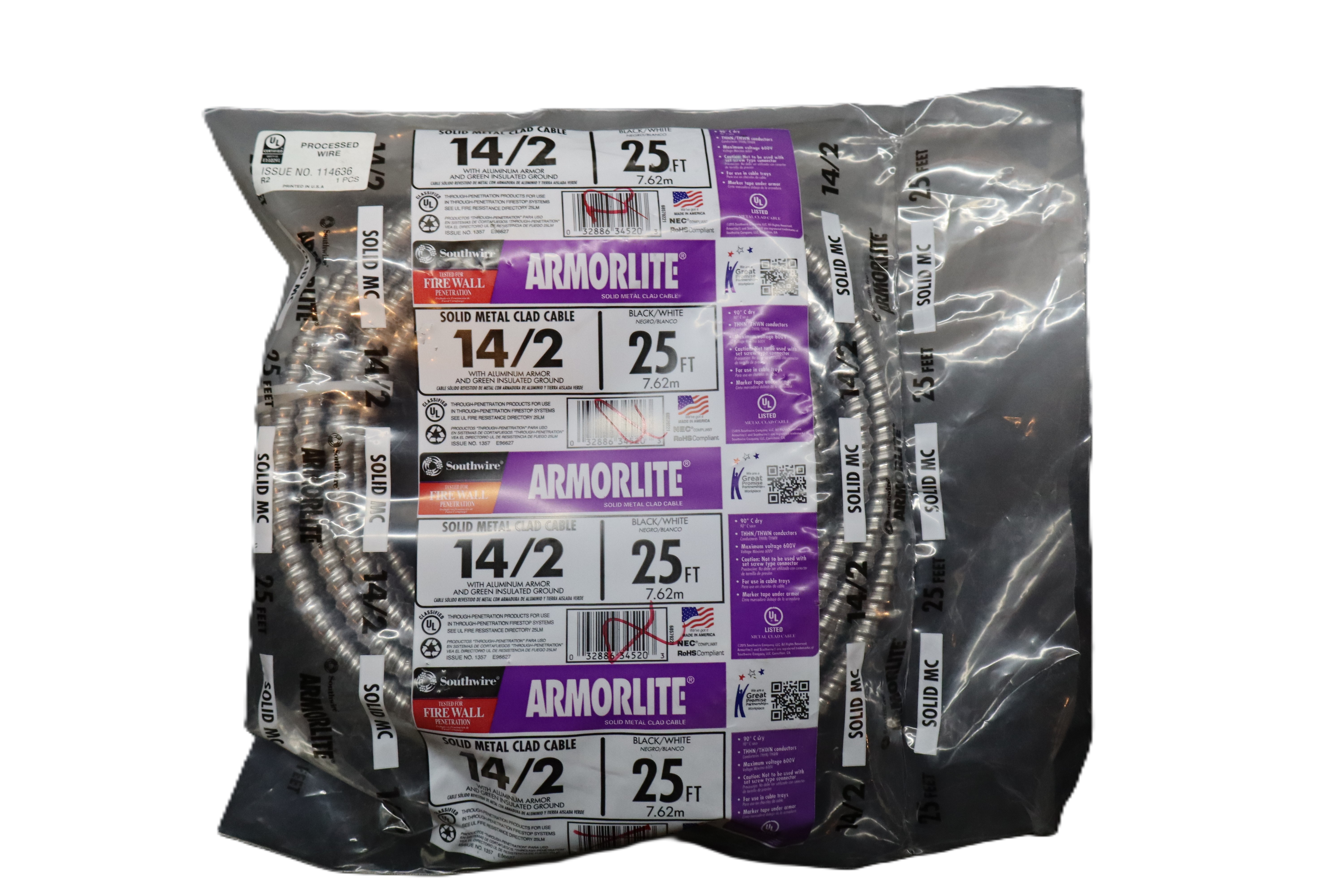 Southwire Armorlite 14/2 Solid Metal Clad Cable, 25 ft, Black/White with Green Ground