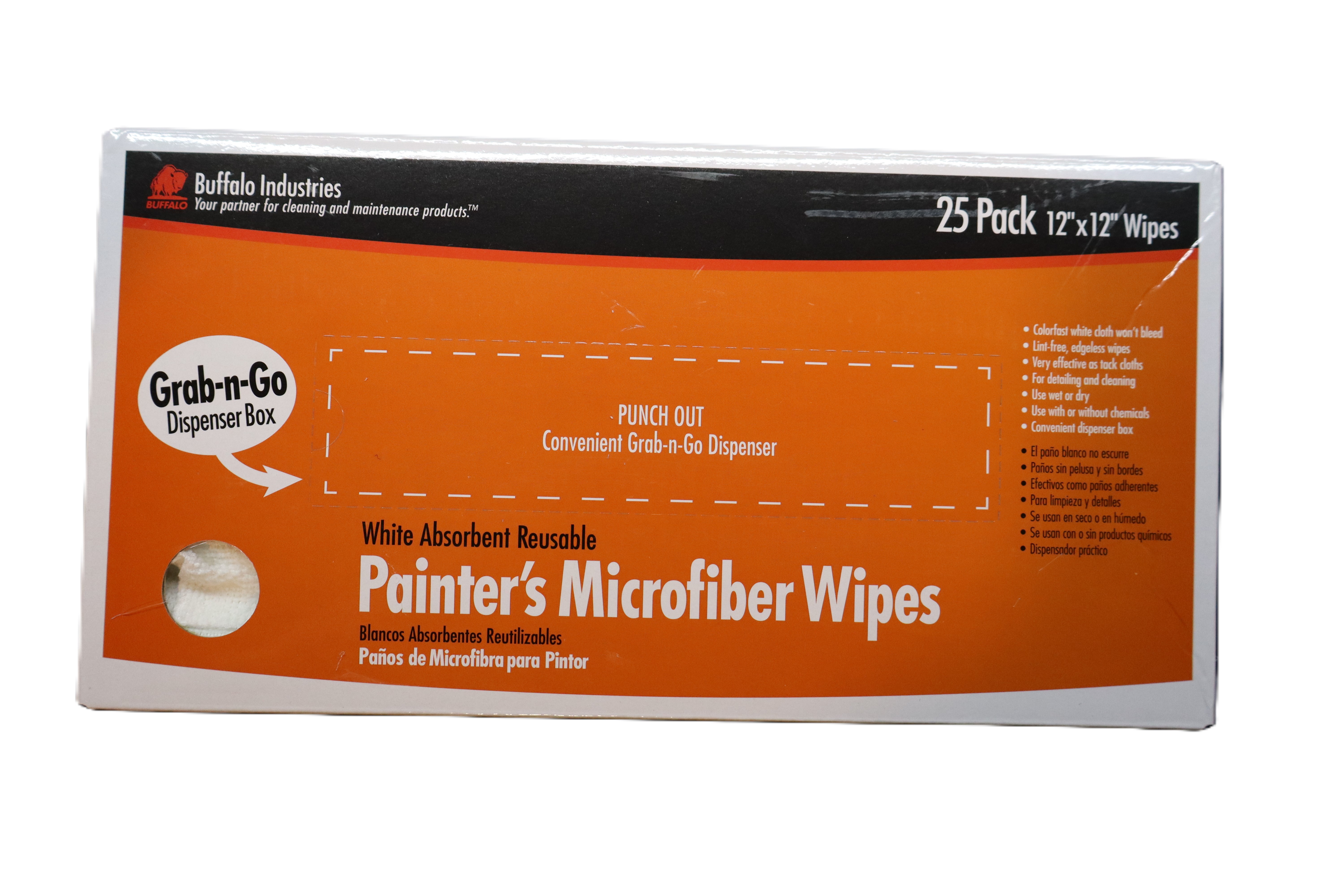 Buffalo Industries Painter’s Microfiber Wipes, 25 Pack, 12" x 12", White Absorbent Reusable Grab-n-Go Dispenser Box