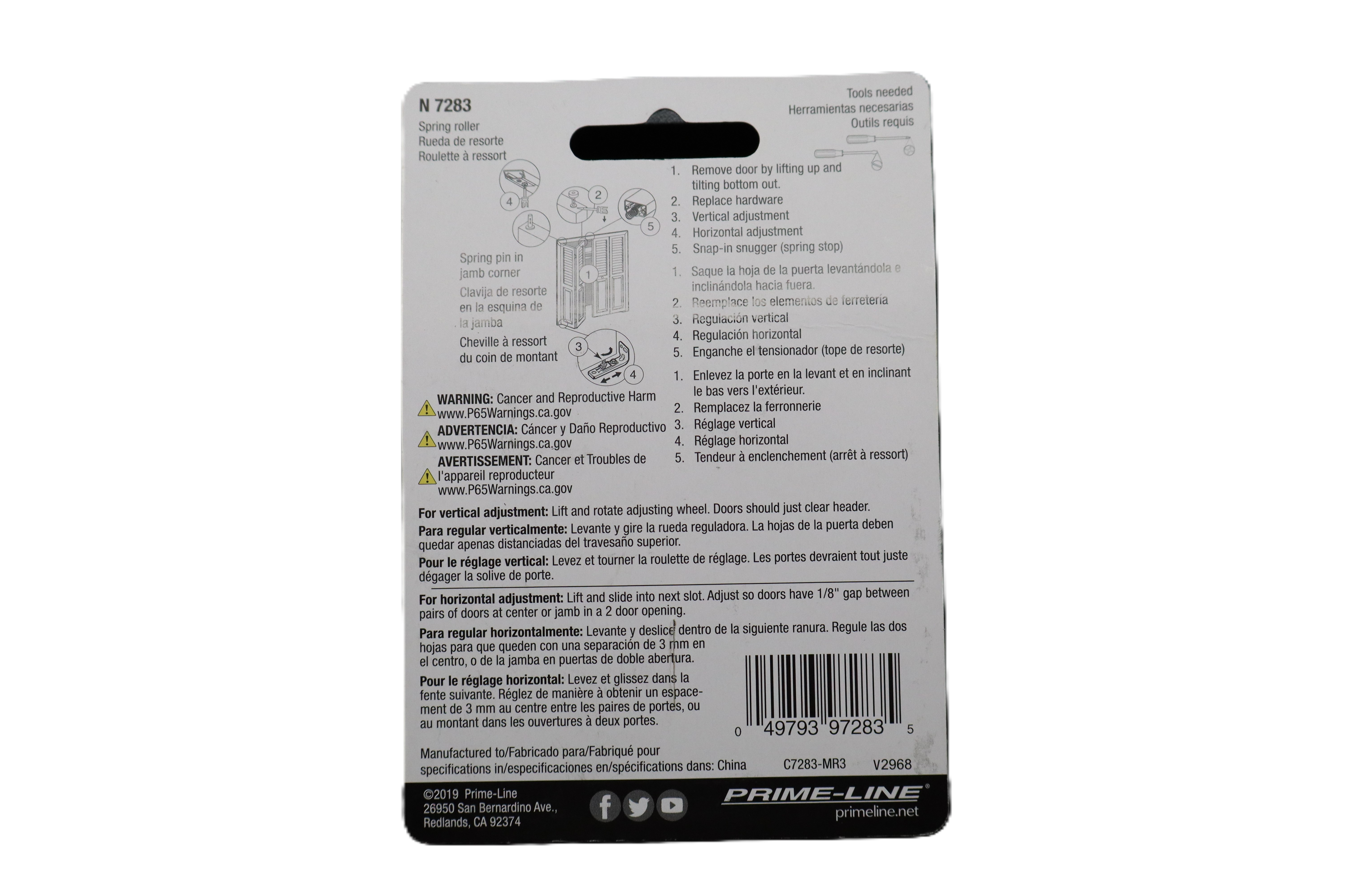Repair and restore smooth operation to bi-fold closet doors with the Prime-Line N 7283 Bi-Fold Door Repair Kit. This kit includes replacement spring roller hardware and related components designed for bi-fold door repair and adjustment. It helps with vertical and horizontal door alignment and includes a snap-in snugger spring stop for proper fit and function. Ideal for replacing worn or damaged hardware in compatible bi-fold door systems. Specifications Brand: Prime-Line Model Number: N 7283 Product Type: Bi-fold door repair kit Application: Bi-fold doors Main Component: Spring roller Includes: Assorted repair hardware, spring roller, bracket, fasteners, and wood knob/pull Function: Door repair and replacement hardware Adjustments Supported: Vertical and horizontal adjustment Pack Size: 1 kit Color/Finish: Mixed materials / assorted finish