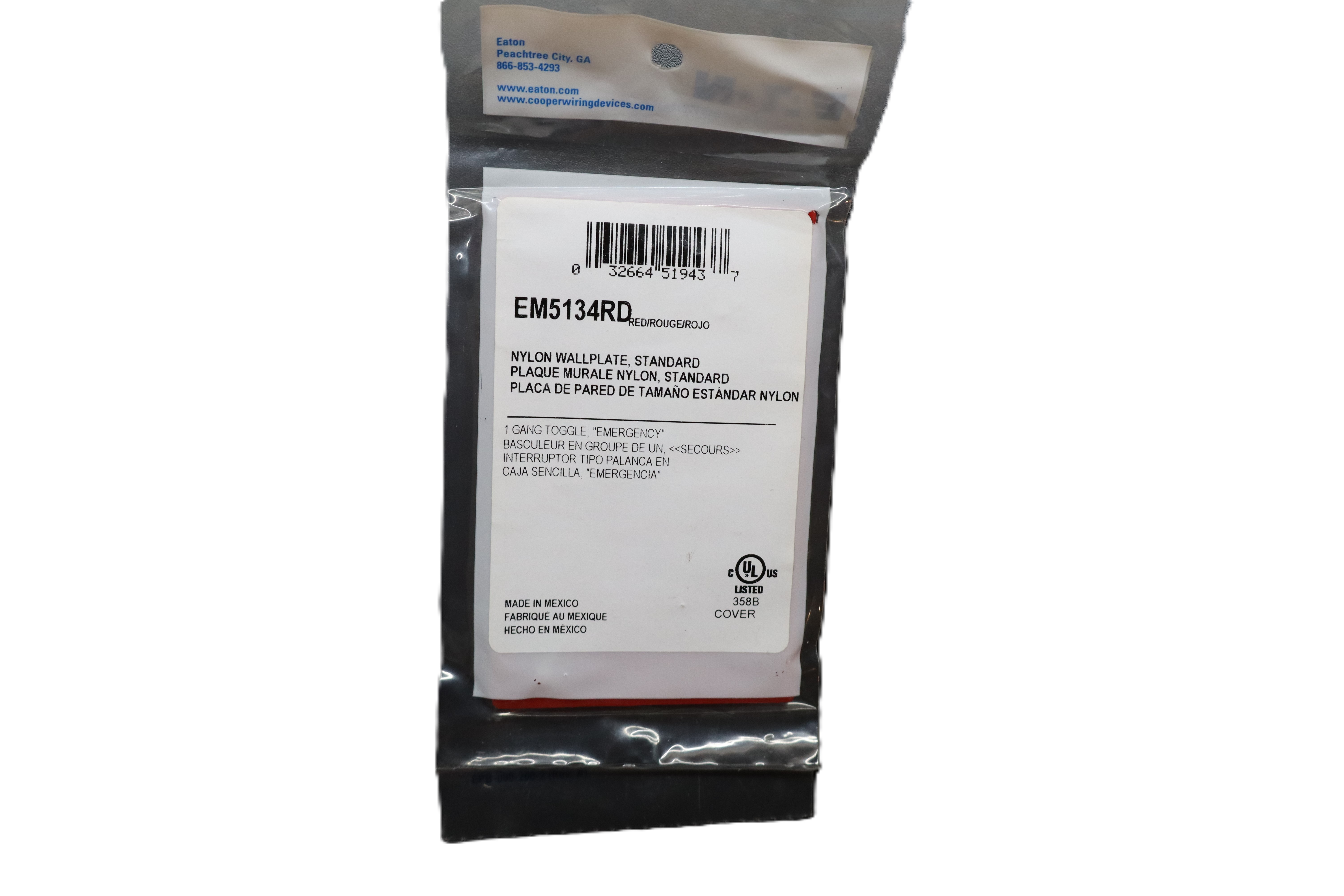 Red nylon wall plate cover from Eaton, designed for a single-gang toggle switch and clearly marked “EMERGENCY” for quick identification. Standard-size plate made for commercial, industrial, or institutional applications where emergency circuits or switches need to be visibly labeled. Durable nylon construction helps resist cracking and wear in high-use environments. Specs Brand: Eaton Model number: EM5134RD Product type: Wall plate cover Configuration: 1-gang toggle Labeling: “EMERGENCY” Color: Red Material: Nylon Size: Standard Style: Single toggle opening UL listed: Yes Country of manufacture: Mexico UPC: 032664519437