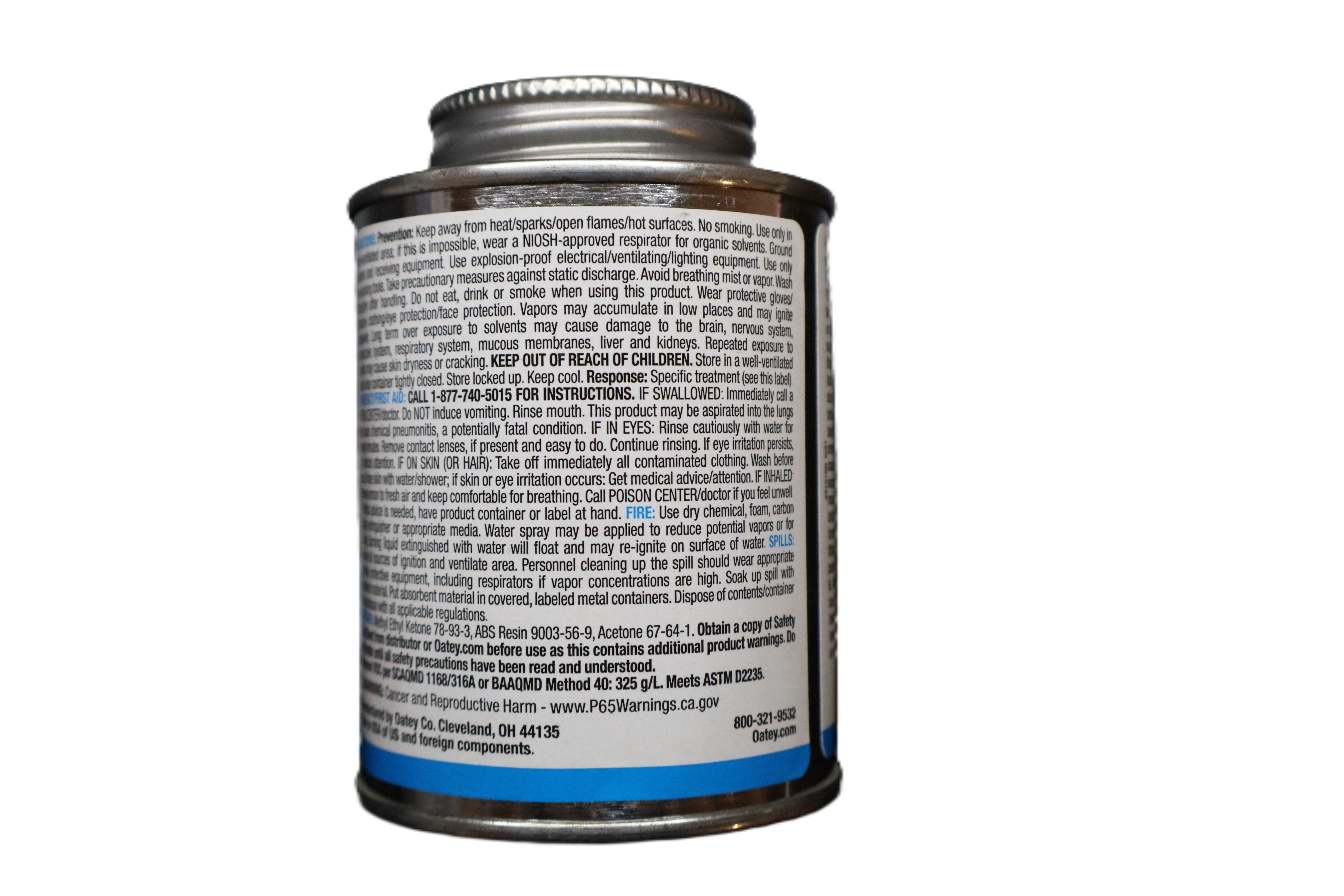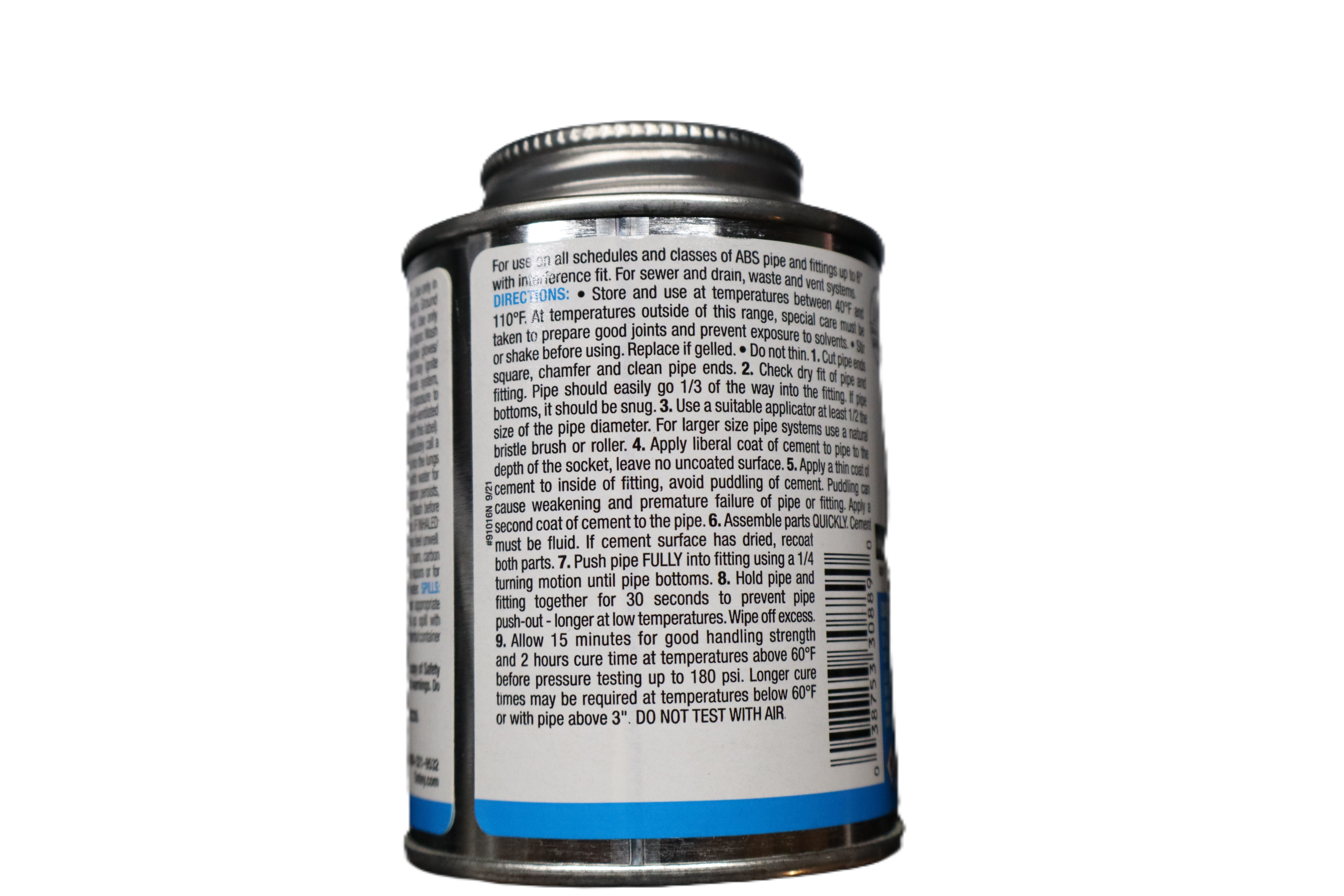 Oatey Medium Black ABS Cement is a solvent cement designed for ABS pipe and fitting connections in drain, waste, and vent (DWV) and sewer applications. This medium-bodied black cement is suitable for all schedules and classes of ABS pipe and fittings up to 6 inches with an interference fit. The 8 fl oz can includes an applicator and is formulated for dependable bonding when used as directed. Specs / Features Brand: Oatey Product Name: Medium Black ABS Cement Model / Part Number: #30889 Size: 8 fl oz / 237 mL Color: Black Cement Type: Medium body ABS solvent cement Compatible Material: ABS pipe and fittings Pipe Size Compatibility: Up to 6 in Application: Sewer, drain, waste, and vent systems Recommended Use Temperature: 40°F to 110°F (5°C to 43°C) Standard Compliance: Meets ASTM D2235 VOC Compliance: SCAQMD 1168/316A or BAAQMD Method 40 VOC Level: 325 g/L Container Type: Metal can with screw cap