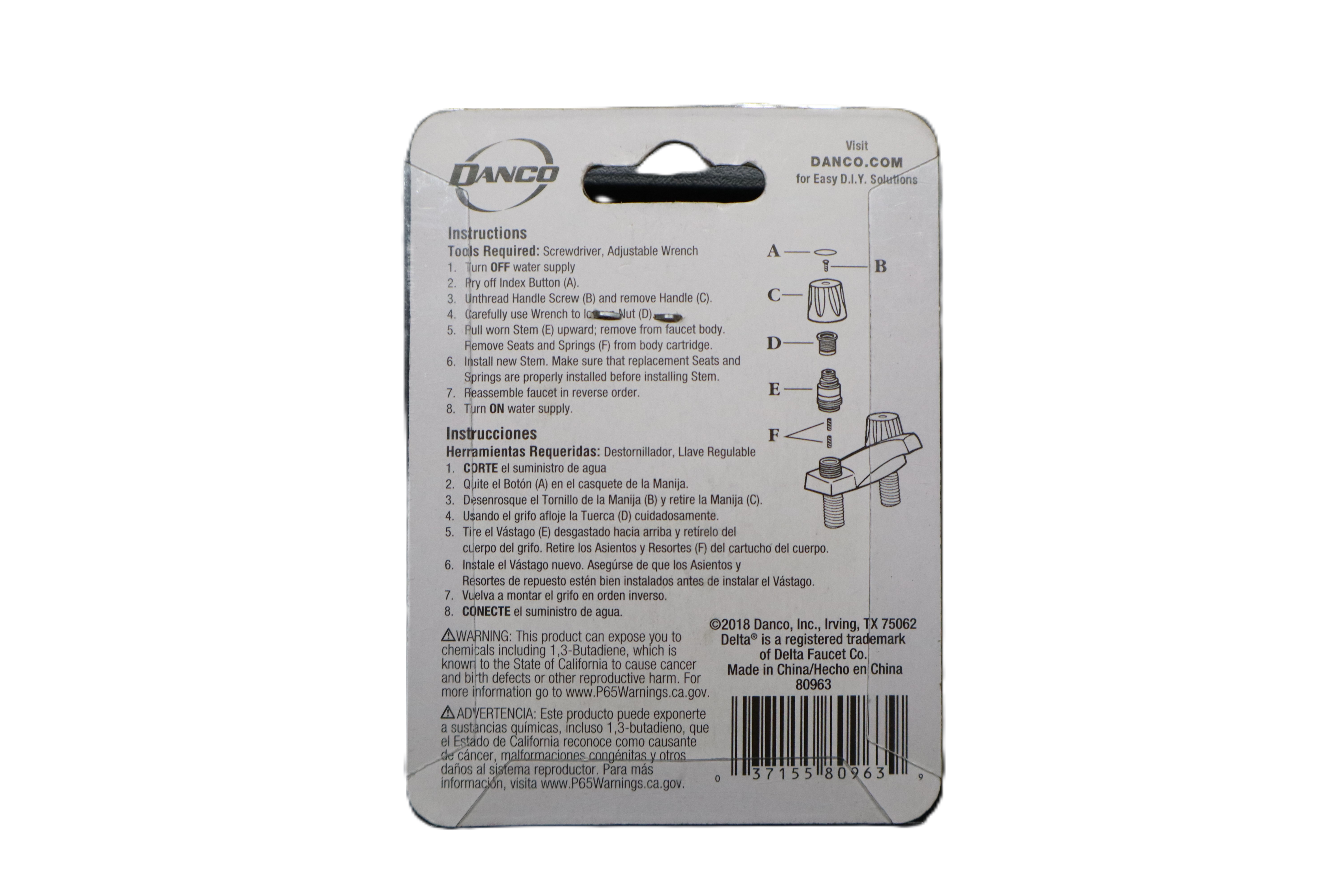 Product Description The Danco 80963 Hot/Cold Stem is a replacement faucet stem made for compatible Delta faucets. Designed to help restore proper water control and repair leaking or worn faucet assemblies, this replacement part is suitable for hot or cold side applications. It comes packaged for easy identification and installation as part of routine faucet maintenance. Specs / Features Brand: Danco Model / Part Number: 80963 Product Type: Hot/Cold stem Compatible Brand: Delta faucets Application: Faucet repair and replacement Use: Fits hot or cold faucet side Color: White/gray stem with black rubber ring and metal spring Pack Size: 1 piece Packaging Type: Blister card