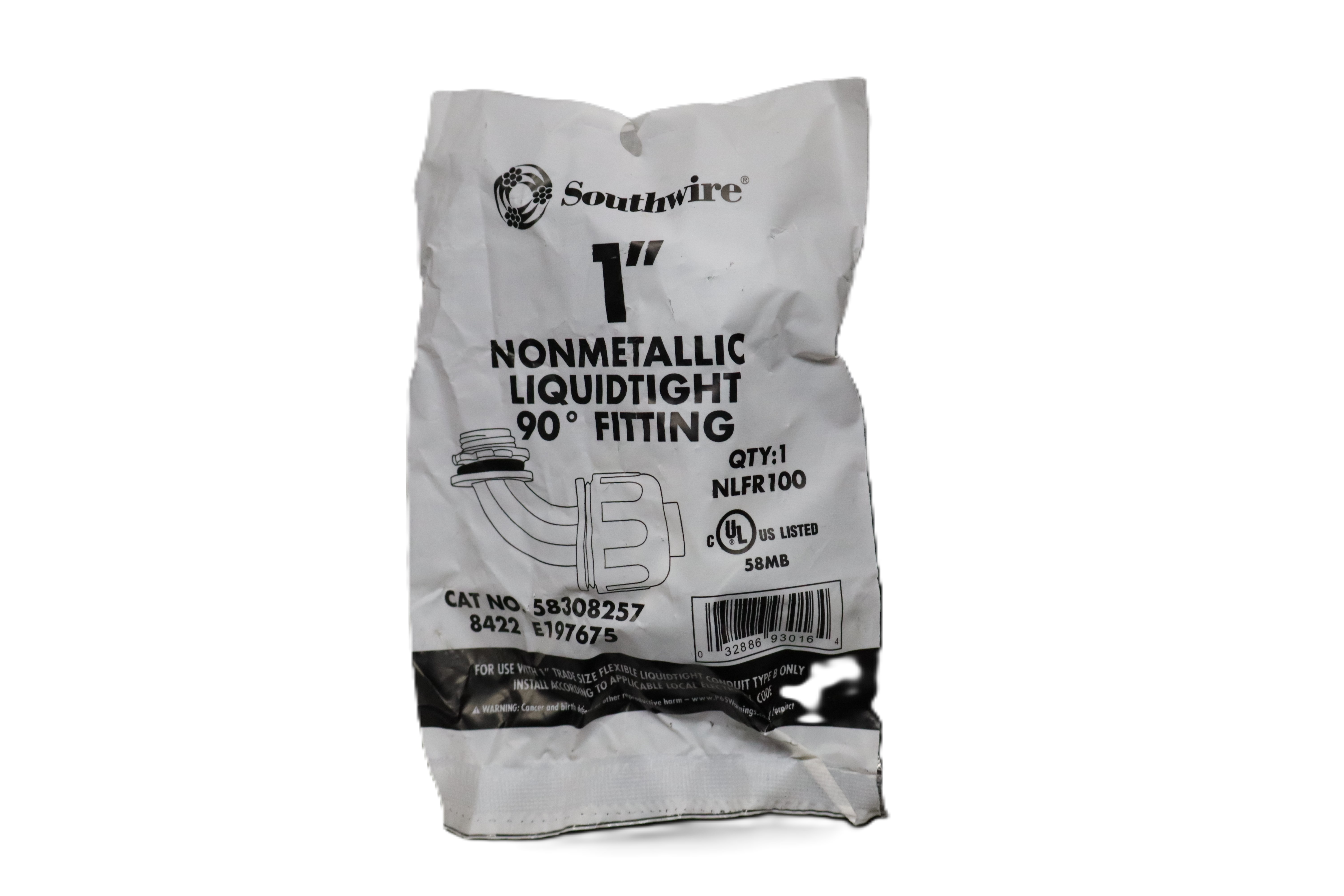 The Southwire 1 in Nonmetallic Liquidtight 90° Fitting is designed for use with 1-inch trade size flexible liquidtight conduit, Type B only. This nonmetallic 90-degree connector helps create a secure, liquidtight connection where conduit needs to change direction into an enclosure or box. Packaged as a single fitting, it is UL listed and suitable for electrical conduit installations where a durable nonmetallic connection is required. Specs / Features Brand: Southwire Product Type: Nonmetallic liquidtight 90° fitting Trade Size: 1 in Angle: 90 degree Model / Part Number: NLFR100 Catalog Number: 58308257 Quantity: 1 Material: Nonmetallic Application: For use with 1 in trade size flexible liquidtight conduit, Type B only Certification: cULus Listed UL File / Marking: 58MB Color: Gray Packaging: Individual bagged fitting