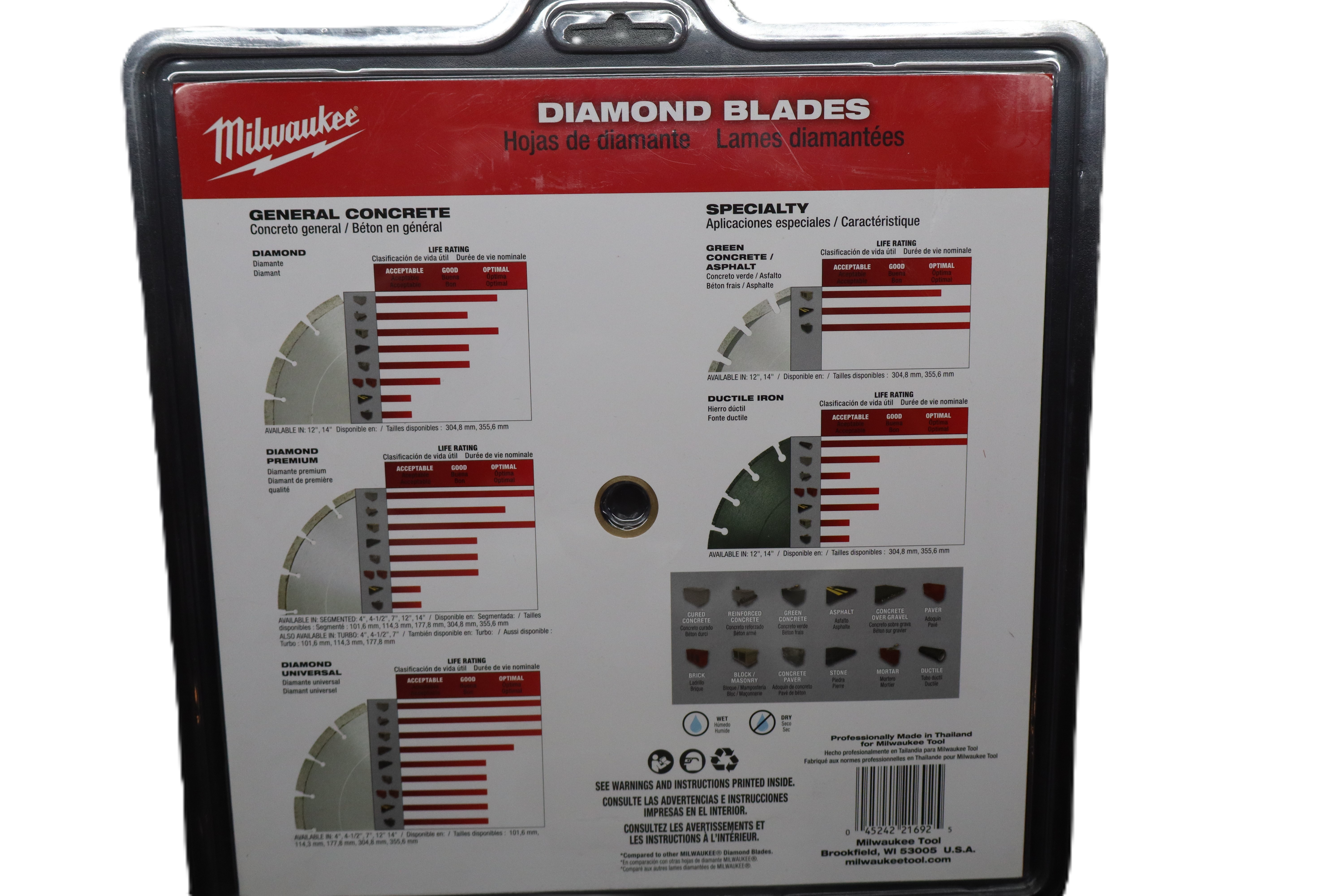 The Milwaukee 49-93-7025 Diamond Premium Blade is built for fast cutting and extended life in demanding masonry and concrete applications. This 9-inch (230mm) diamond blade is designed for use on compatible saws and features a premium segmented rim for aggressive cutting performance. Ideal for concrete, brick, block, pavers, stone, and other masonry materials, it offers professional-grade durability for both wet and dry cutting applications. Specifications Brand: Milwaukee Model Number: 49-93-7025 Product Type: Diamond blade Blade Diameter: 9 in. / 230 mm Blade Type: Diamond Premium Rim Style: Segmented Arbor Compatibility: 5/8 in., 7/8 in. and diamond arbor sizes Max Speed: 6,790 RPM Cutting Style: Fast cutting Performance Feature: Extended life Application: Concrete, masonry, brick, block, pavers, and stone Wet/Dry Use: Suitable for wet and dry cutting Pack Size: 1 blade