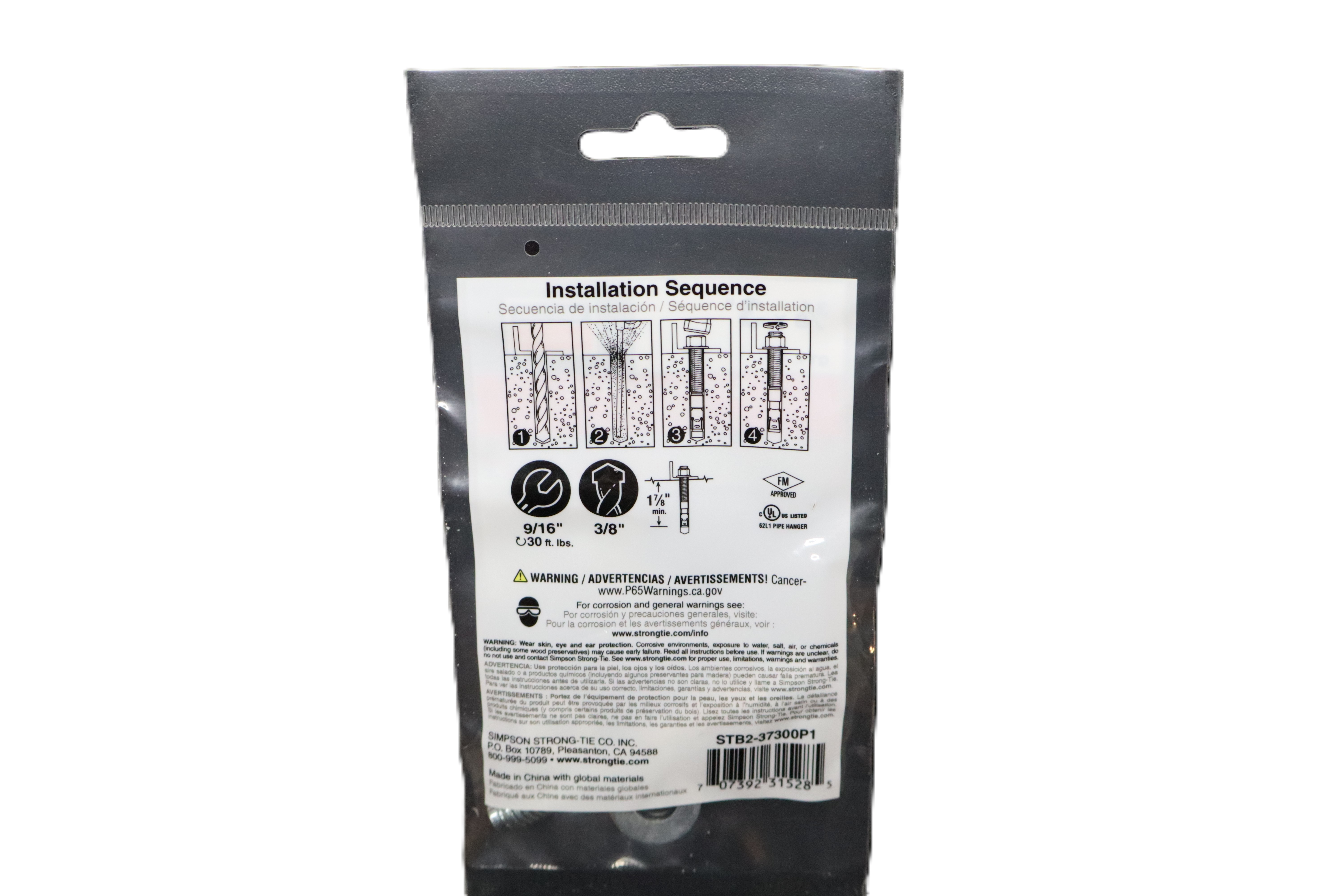 The Simpson Strong-Tie Strong-Bolt 2 is a zinc-plated wedge anchor designed for anchoring into concrete. This 3/8 in x 3 in anchor is packaged as a single unit and features a special alloy expansion clip for strong, reliable performance. Suitable for cracked concrete applications, it is ideal for fastening structural or mechanical components where a secure concrete anchor is required. Specs / Features Brand: Simpson Strong-Tie Product Line: Strong-Bolt 2 Product Type: Wedge anchor Model / Part Number: STB2-37300P1 Anchor Size: 3/8 in x 3 in Quantity: 1 Finish: Zinc plated Base Material: Concrete Suitable For: Cracked concrete Minimum Embedment: 1-7/8 in Drill Bit Size: 3/8 in Wrench Size: 9/16 in Torque: 30 ft-lbs Approvals Listed on Package: FM Approved, UL Listed (621 Pipe Hanger) Packaging: Retail pouch