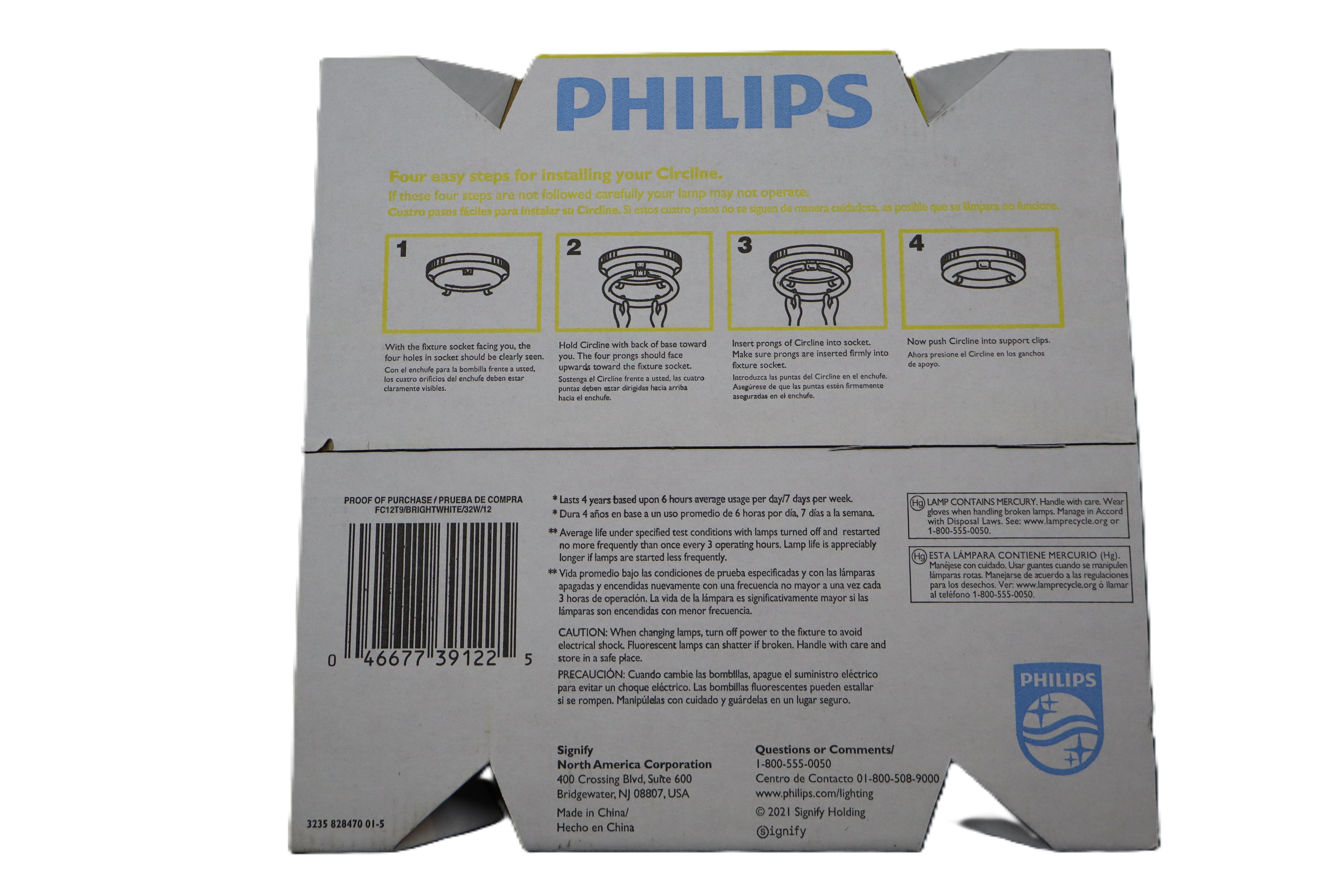 Philips Bright White for Kitchen & Bath T9 Circline is a 32-watt circular fluorescent bulb designed to provide bright, comfortable white light for kitchens, bathrooms, and other indoor spaces. Its bright white output helps colors appear more accurate while creating a clean, pleasant atmosphere. This 12-inch circline lamp uses a 4-pin base for compatibility with matching fixtures and is designed for long-lasting everyday use. Key Specs Brand: Philips Product Type: T9 Circline fluorescent lamp Light Color: Bright White Recommended Use: Kitchen, bath, or any room Wattage: 32 watts Bulb Size: 12 inches Shape: Circline Base Type: 4-pin Model / Identifier: FC12T9/BRIGHTWHITE/32W/12 UPC: 046677391225 Rated Life: Up to 4 years based on average use noted on package Country of Manufacture: Made in China