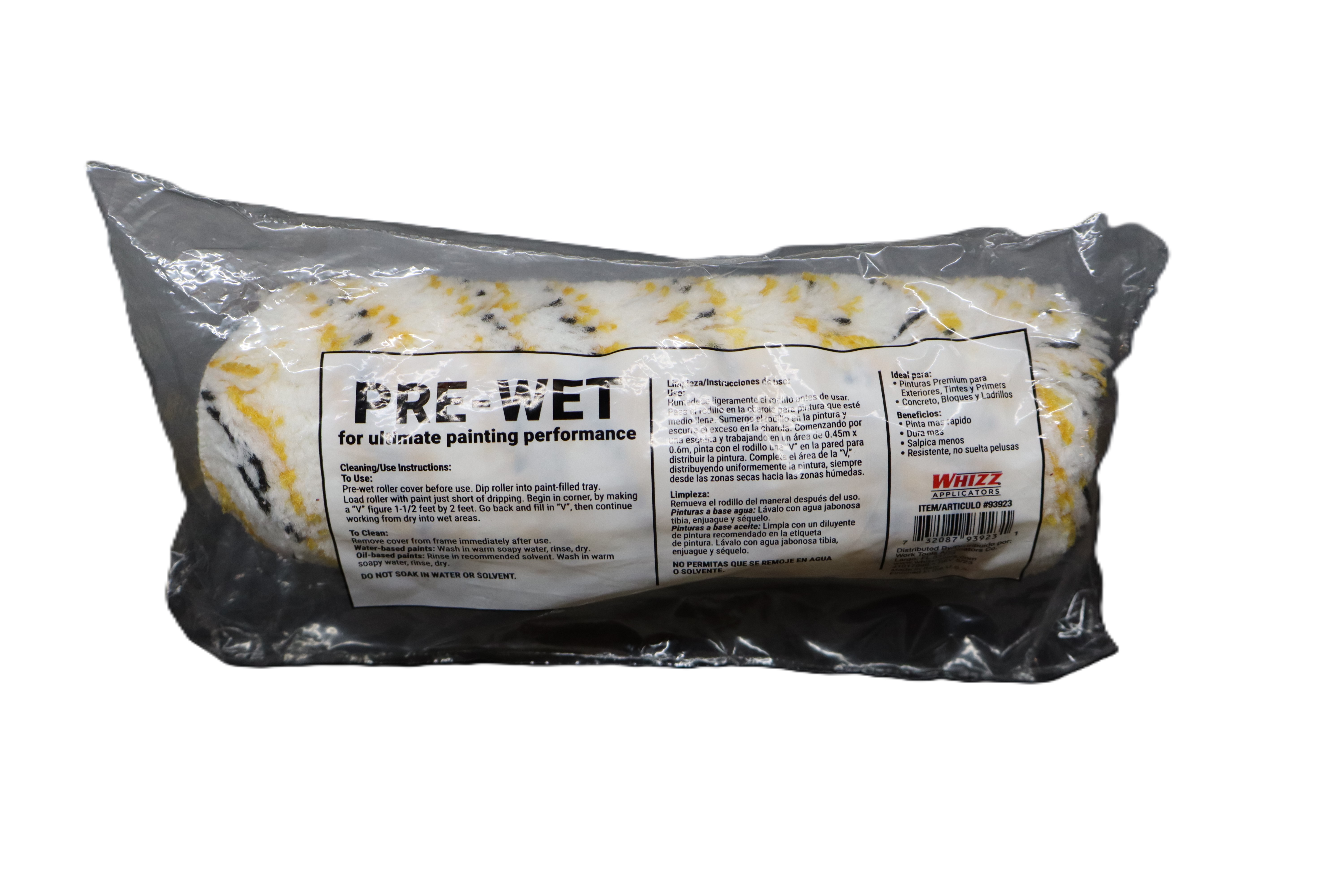 Whizz Maximum roller cover designed for concrete, block, and brick surfaces. Made for use with premium exterior paints, stains, and primers. Pre-wet design for ultimate painting performance with maximum coverage. Built to paint fast, last longer, reduce splatter, and resist shedding. Product Details / Specs: Brand: Whizz Product Line: Maximum Product Type: Roller Cover Surface Use: Concrete, Block & Brick Size: 9 in. Nap Size: 1-1/4 in. Use With: Premium exterior paints, stains, and primers Features: Pre-wet, maximum coverage, paints fast, lasts longer, less splatter, shed resistant Item Number: 93923