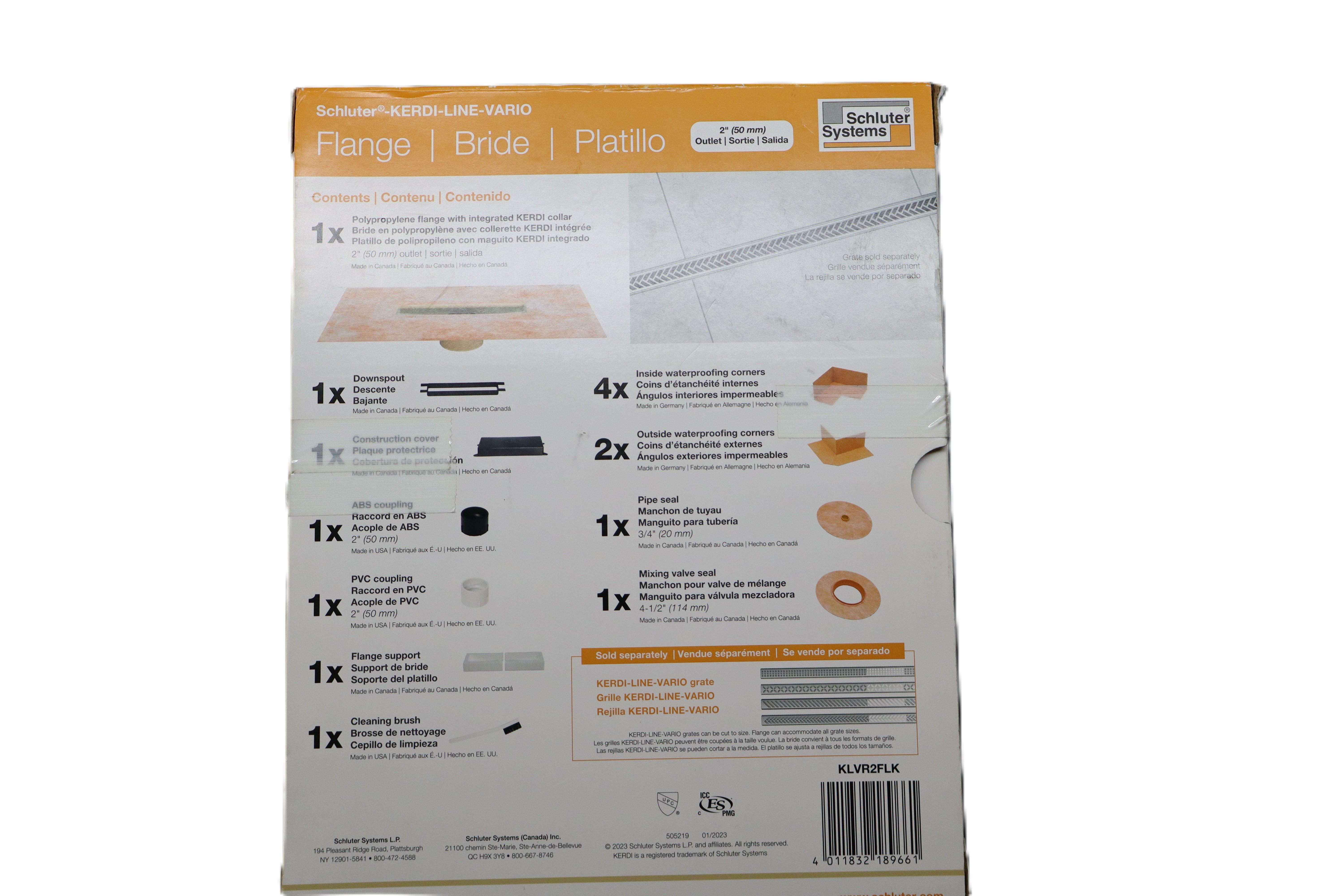 Schluter KERDI-LINE-VARIO flange kit for linear drain installations with a 2 in. (50 mm) outlet. Designed for use with Schluter KERDI-LINE-VARIO grates and made for tiled shower applications. Features an integrated KERDI collar for a secure waterproof connection and includes both PVC and ABS couplings. Product Details / Specs: Brand: Schluter Systems Product Line: KERDI-LINE-VARIO Product Type: Flange / Linear Drain Flange Kit Model: KLVR2FLK Outlet Size: 2 in. (50 mm) Application: Tiled showers Compatibility: For use with Schluter KERDI-LINE-VARIO grates Waterproofing: Integrated KERDI collar Includes: PVC coupling, ABS coupling, downspout, construction cover, flange support, cleaning brush, inside waterproofing corners, outside waterproofing corners, pipe seal, mixing valve seal