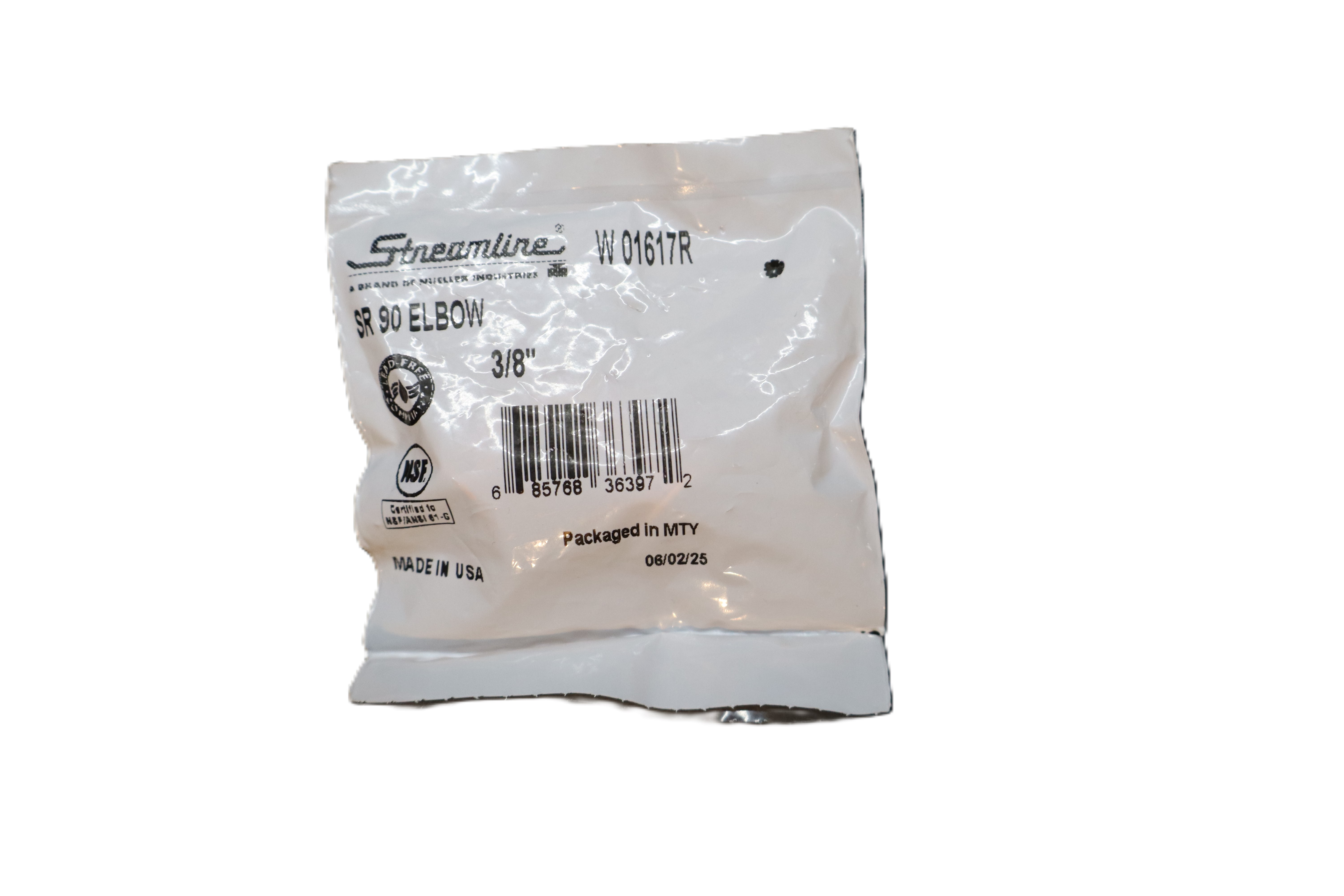 Lead-free copper 90-degree elbow fitting from Streamline, designed to change direction in copper tubing runs. This fitting is sized for 3/8-inch copper pipe/tube and is suitable for potable water applications. Individually packaged and made in the USA, it is a dependable choice for plumbing repairs, maintenance, and new installations. Specs Brand: Streamline Product type: 90° elbow Material: Copper Size: 3/8 in. Model number: W01617R Lead free: Yes Certification: NSF certified Potable water compatible: Yes Country of manufacture: USA Package quantity: 1 piece
