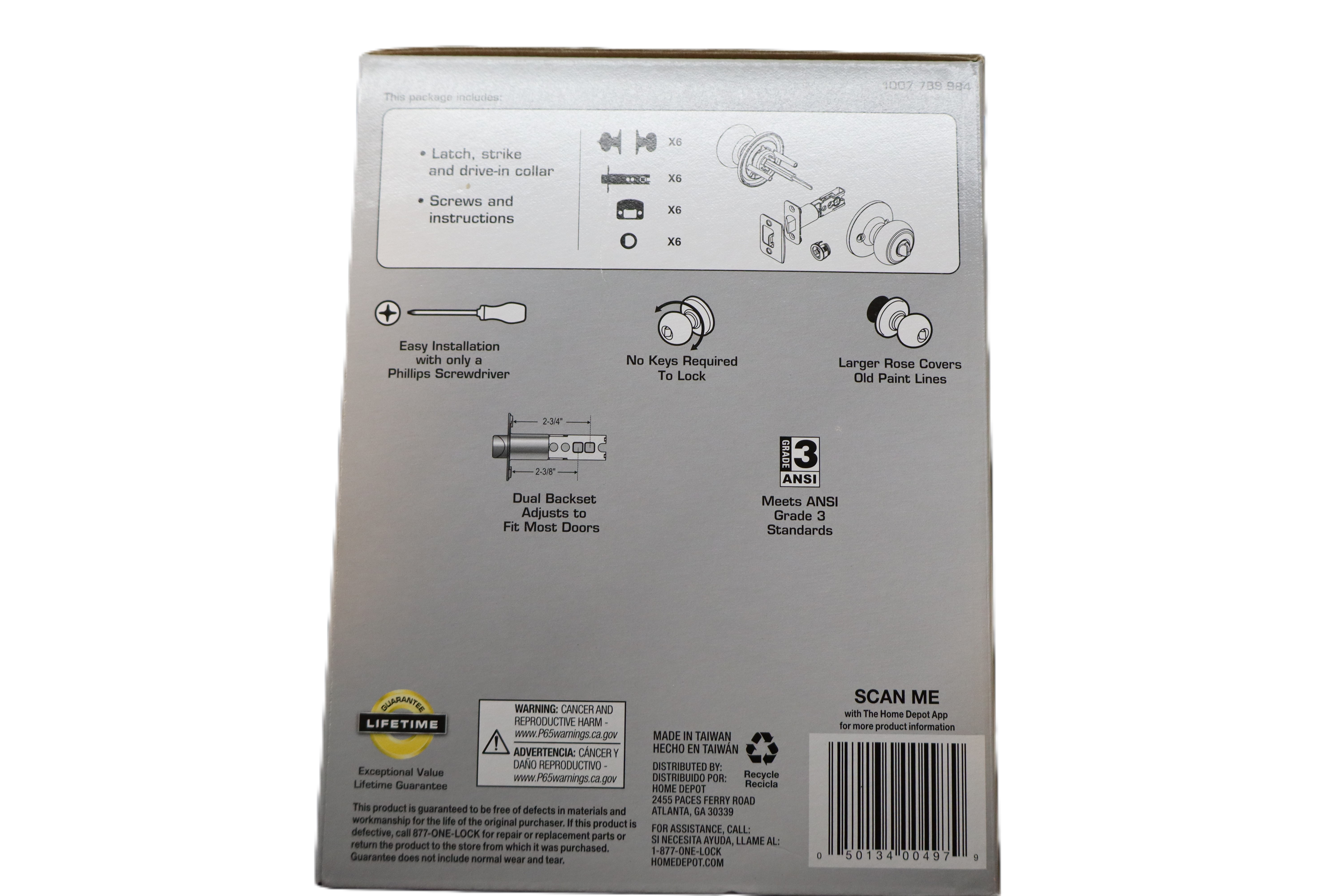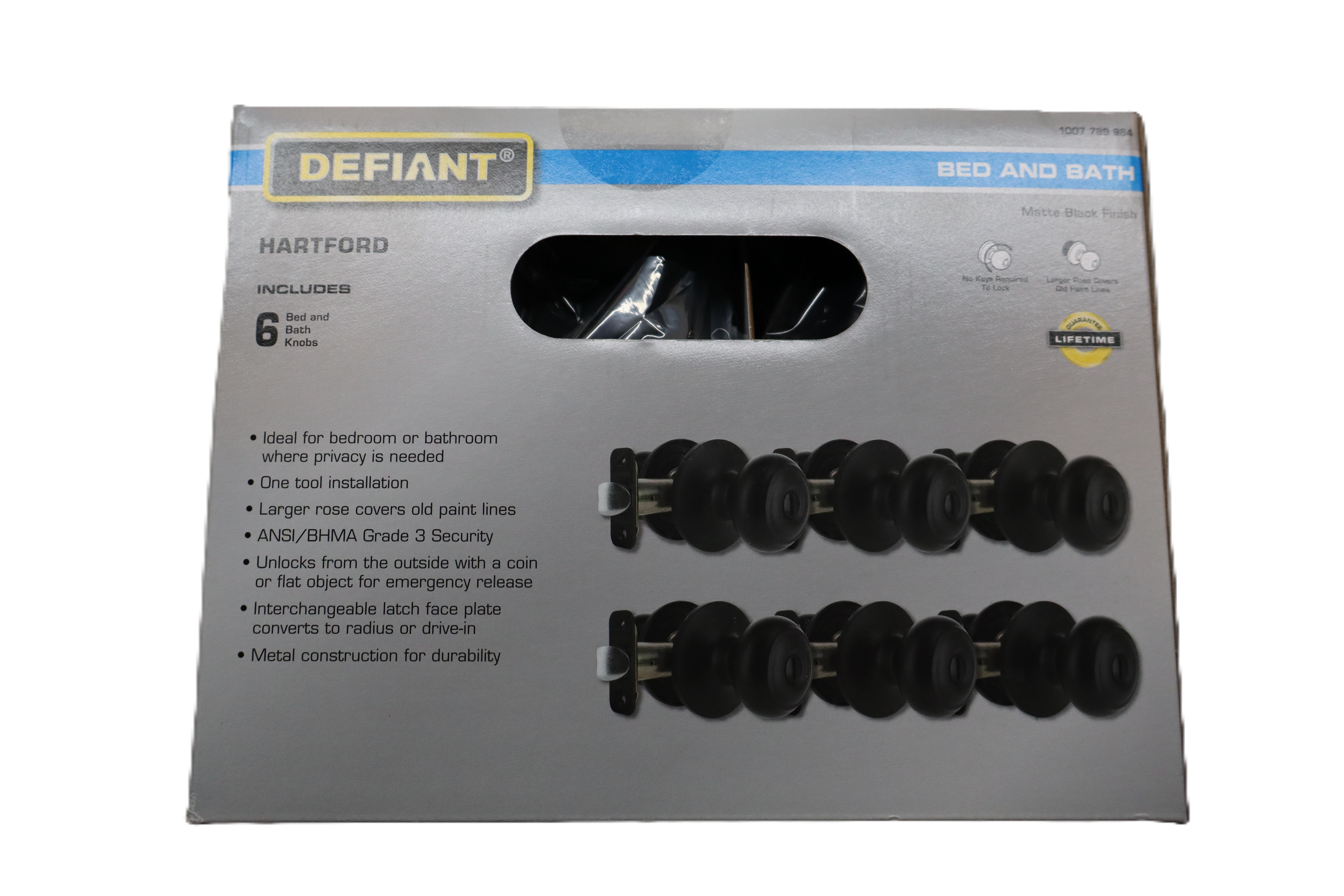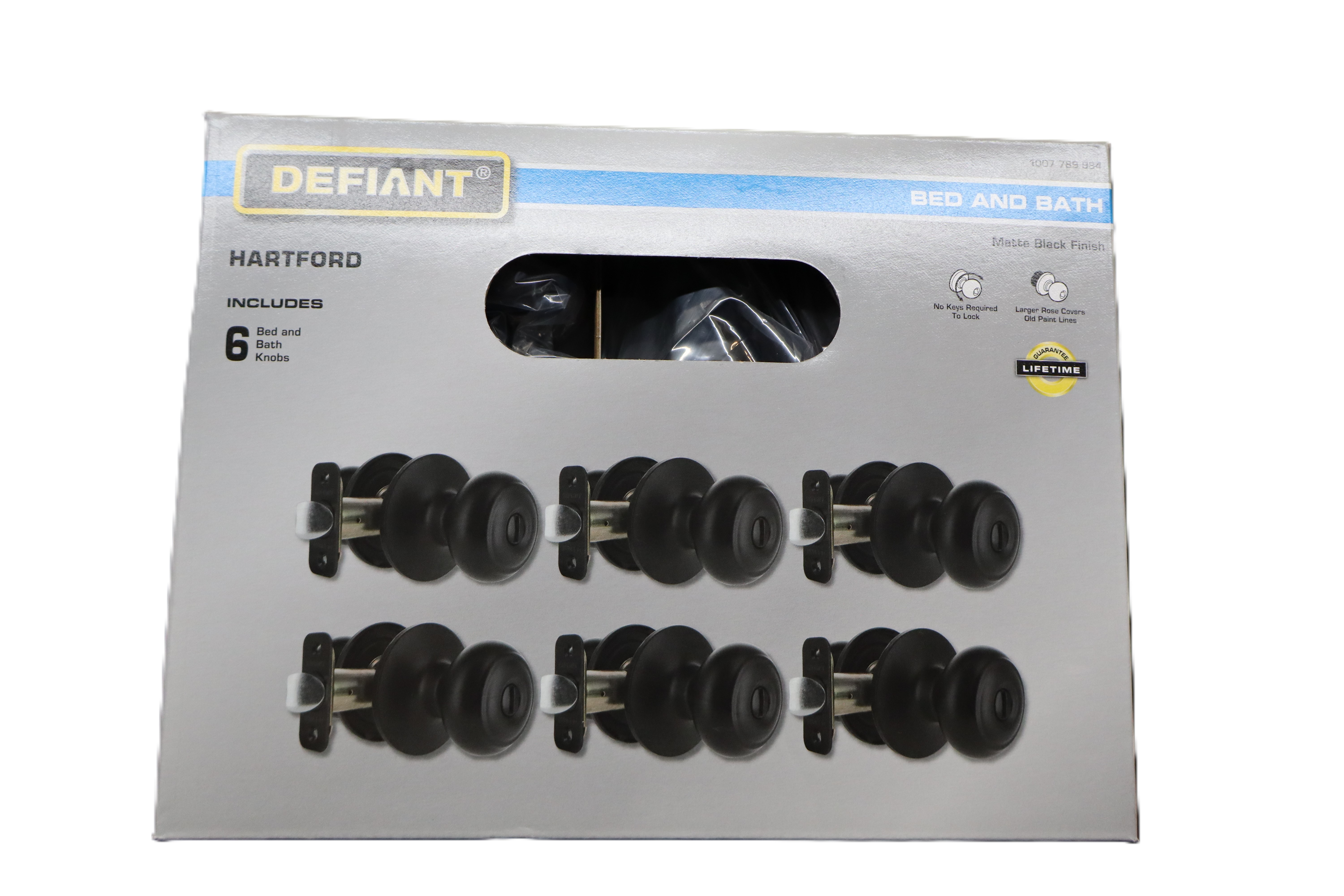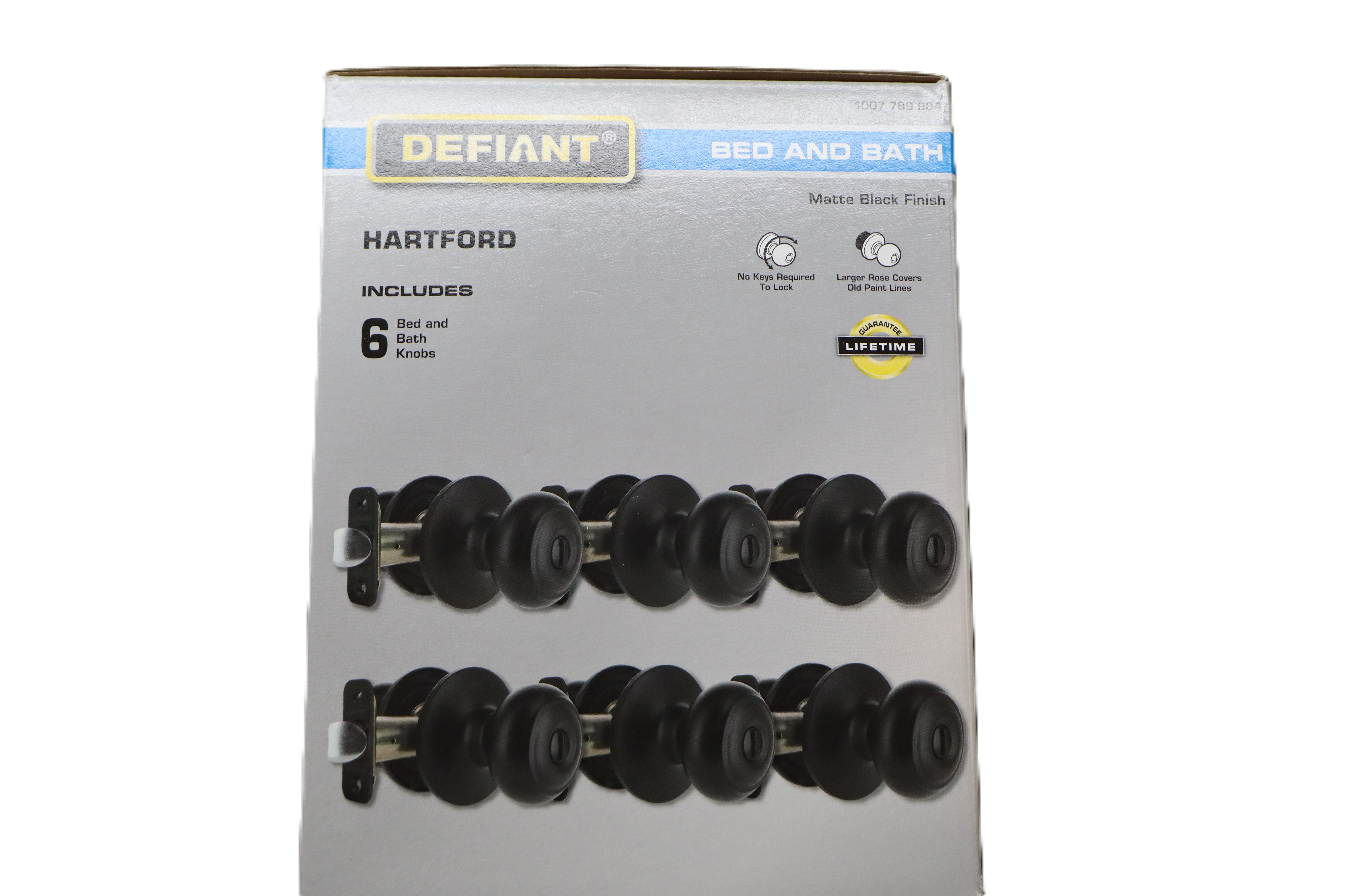 Defiant Hartford bed and bath door knobs are designed for interior doors where privacy is needed, such as bedrooms and bathrooms. This 6-pack features a matte black finish and a privacy function that locks without a key, with emergency release access from the outside using a coin or flat object. The larger rose helps cover old paint lines, while the metal construction is built for everyday durability. Designed for easy installation, these knobs fit most standard doors and meet ANSI Grade 3 standards. Key Specs Brand: Defiant Style / Collection: Hartford Product Type: Bed and bath privacy door knobs Finish: Matte Black Pack Size: 6 knobs Function: Privacy lock Locking Type: No key required to lock Emergency Release: Unlocks from outside with coin or flat object Construction: Metal Installation: One-tool installation with Phillips screwdriver Backset: Dual backset adjusts to fit most doors Latch Type: Interchangeable latch face plate converts to radius or drive-in Security Grade: ANSI/BHMA Grade 3 Included in Package: Latch, strike, drive-in collar, screws, and instructions Warranty: Lifetime guarantee Country of Manufacture: Made in Taiwan Package Highlights Ideal for bedroom or bathroom doors Larger rose covers old paint lines Durable matte black finish Easy installation for multiple interior doors